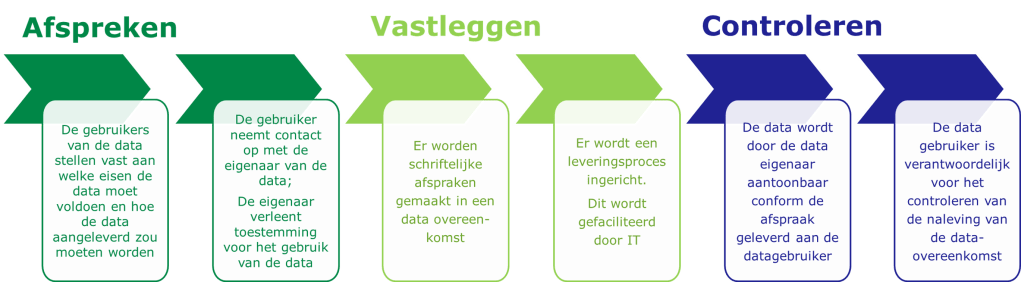 Er worden schriftelijke afspraken gemaakt in een data overeenkomst. Er wordt een leveringsproces ingericht. Dit proces wordt gefaciliteerd door IT.