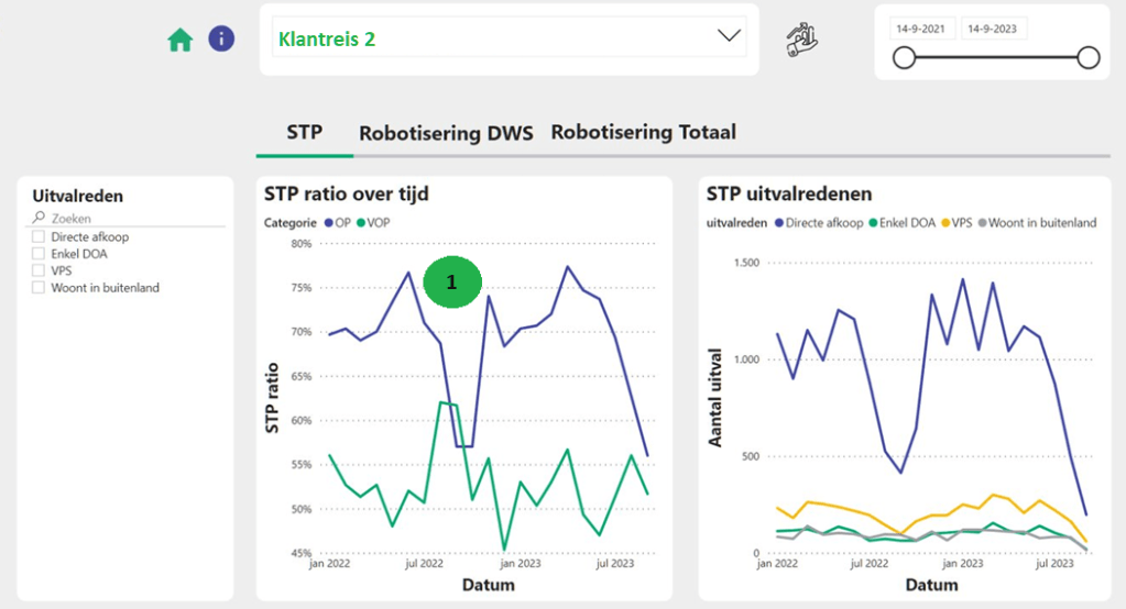 Welke inzicht haal je uit het dashboard als je kijkt naar het groene bolletje?