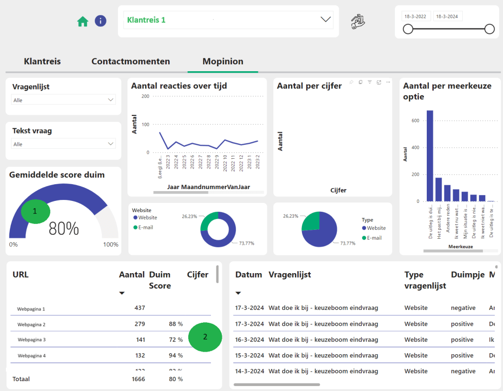 1. De gemiddelde klanttevredenheid online is 80% (zie groene bolletje 1)