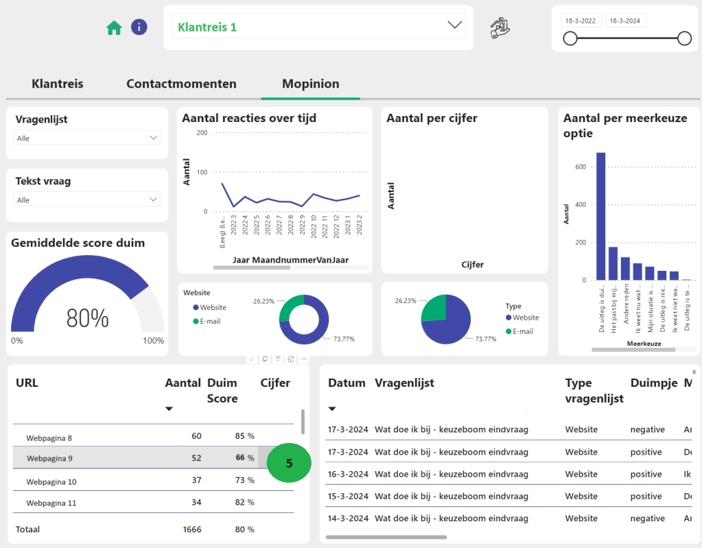 De makkelijkste manier om te monitoren of wijzigingen effect hebben is via een dashboard. Zeker als er al een dashboard bestaat waarin de gewenste data getoond wordt. In het voorbeeld kunnen we zien welke beoordelingen wanneer gegeven zijn. Dat betekent dat we de situatie kunnen vergelijken van voor de wijzingen en die van na de wijziging. Voor de wijziging was de tevredenheid 46%. Wat is het na de aanpassing?