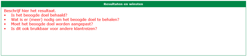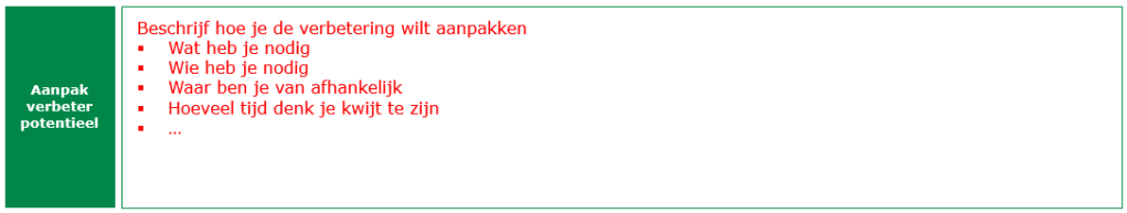 Het volgende gedeelte werk je normaliter pas uit nadat het verbeterpotentieel verzilverd is en je iets kunt zeggen over de behaalde resultaten.