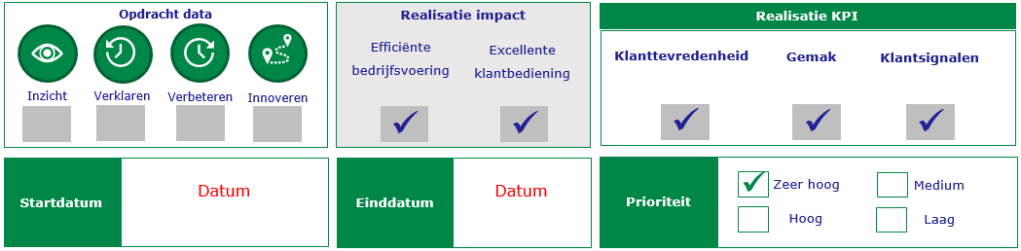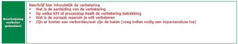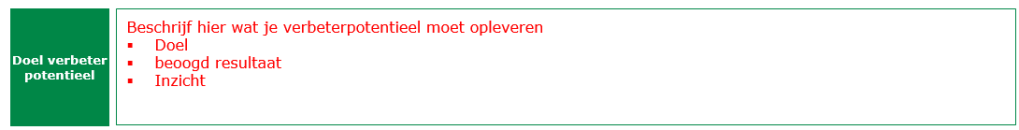 Nu je begrijpt hoe het template werkt en de stappen kent om tot verbeterpotentieel te komen ben je zelf aan zet. Je gaat aan de slag met je eigen verbeterpotentieel in de volgende praktijkopdracht!