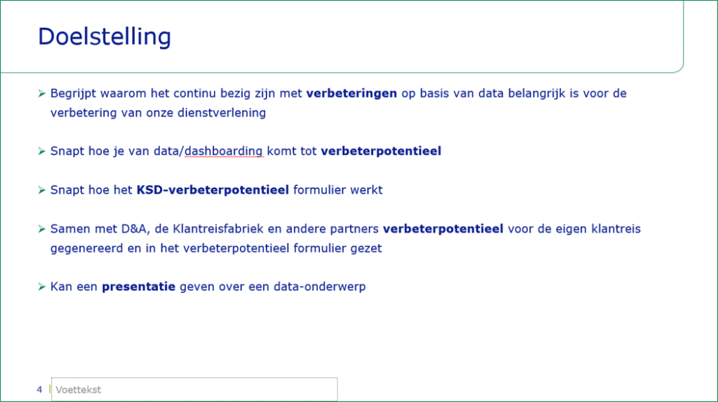 Hierbij kun je denken aan de aanleiding van de presentatie en bijvoorbeeld het doel van de presentatie