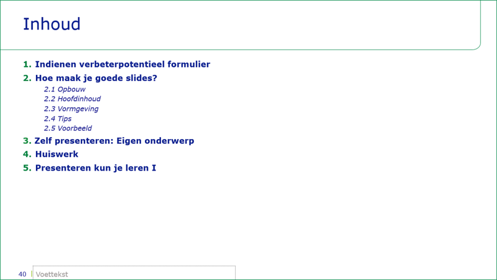 Zeker bij langere presentaties is het fijn om een inhoudsopgave toe te voegen. Hier laat je weten bij welke punten je stil gaat staan en eventueel ook hoe lang. Hiermee geef je je publiek een idee van wat er gaat komen en wanneer.