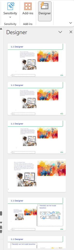 De Designer is een functie in Powerpoint waarmee je snel en gemakkelijk het moeilijke design werk automatisch kan laten doen. In feite komt het erop neer dat je zelf allerlei tekst en afbeeldingen in een Powerpoint-slide stopt en dan het deisgn werk door Powerpoint laat doen. Dit werkt als volgt.